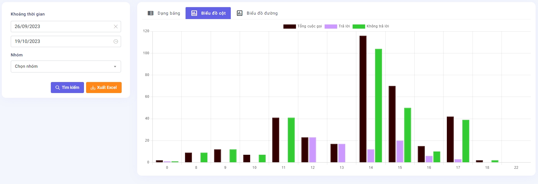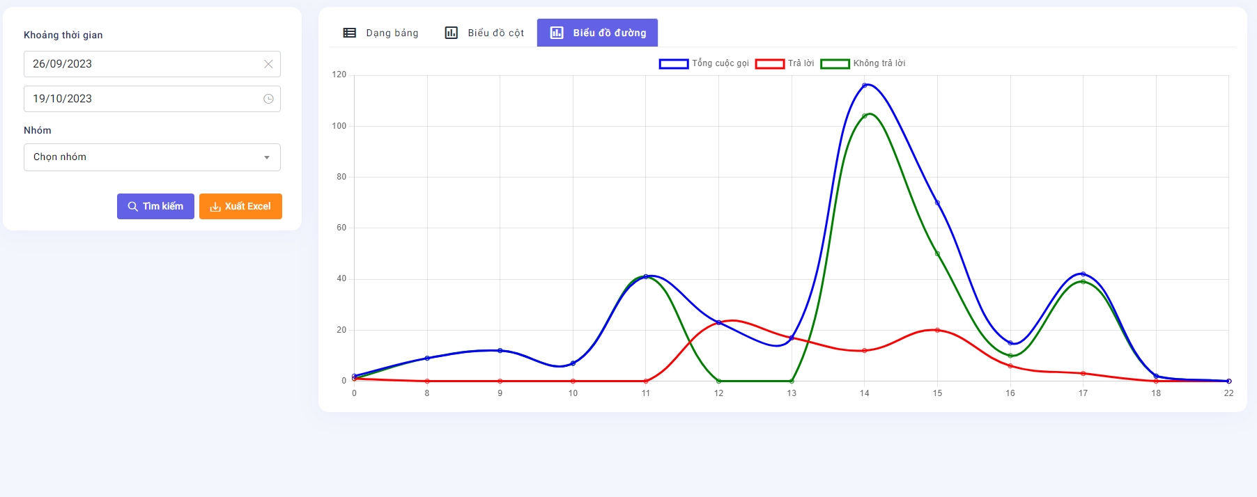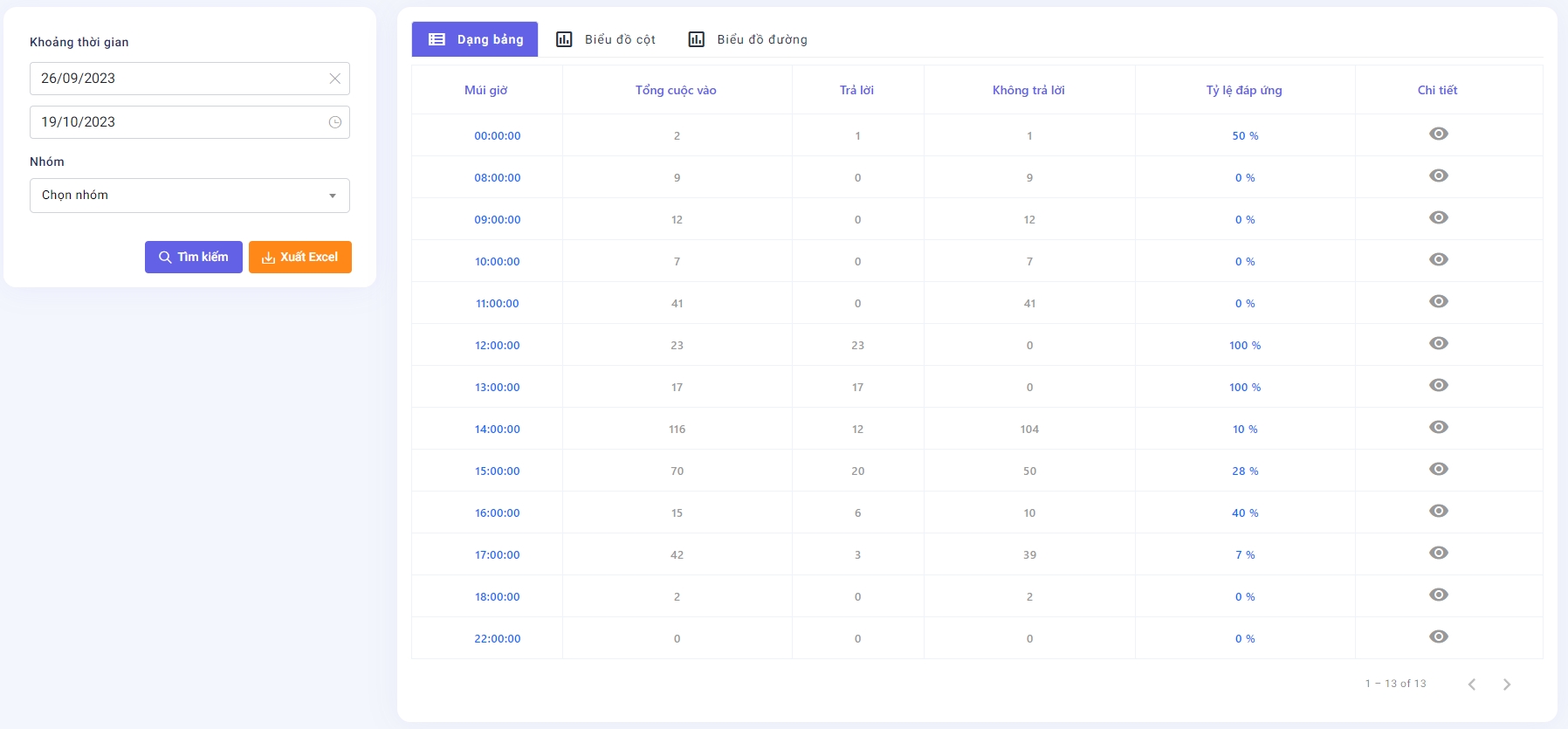 Có thể xem báo cáo theo dạng bảng (hình 1) hoặc biểu đồ cột ( hình 2), biểu đồ đường (hình 3)